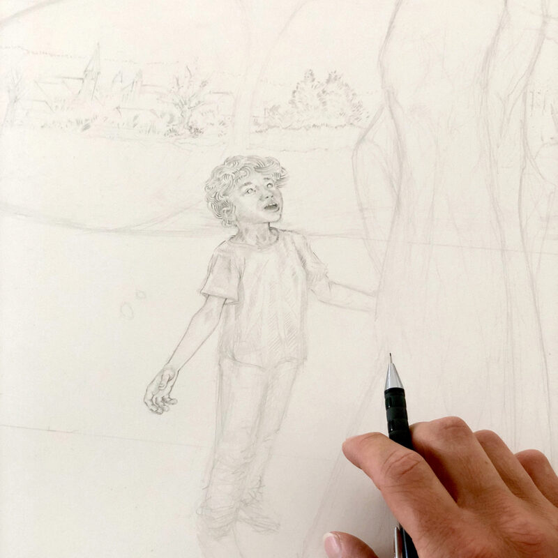 Dans une démarche artistique et éco-responsable, j’ai affiné le concept sous forme de modello : une méthode de la Renaissance qui consiste à réaliser des dessins finaux avant l’exécution de l’œuvre. Une création à la main sur papier grands formats, en dessin et en aquarelle, à la lumière du jour.